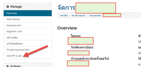5. จะแสดง EPP Code ของโดเมนที่ต้องการย้าย นำรหัสนี้ไปให้กับทางผู้ให้บริการโดเมนที่ลูกค้าต้องการย้ายไป