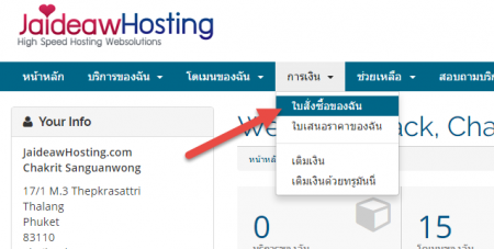 - หลังจากเข้าสู่ระบบพื้นที่สมาชิกที่ https://clients.jaideawhosting.com/clientarea.php ให้คลิกที่เมนู การเงิน -> ใบสั่งซื้อของฉัน ดังภาพ